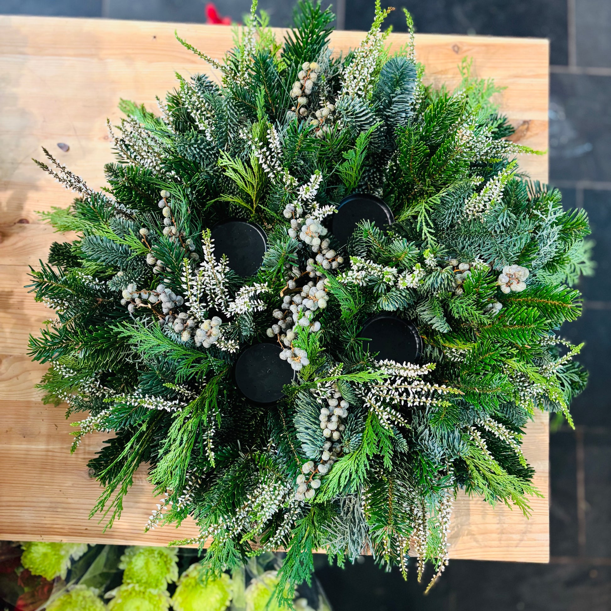 Gjør adventstiden ekstra stemningsfull med vår Adventslys Borddekor, en luksuriøs og naturinspirert juleoppsats fylt med vintergrønt, sesongens teksturer og fire stilrene lysestaker – én for hver søndag i advent. De rike grønntonene, de hvite limoniumblomstene og de dekorative bærene skaper et friskt og moderne uttrykk som løfter hele julebordet.