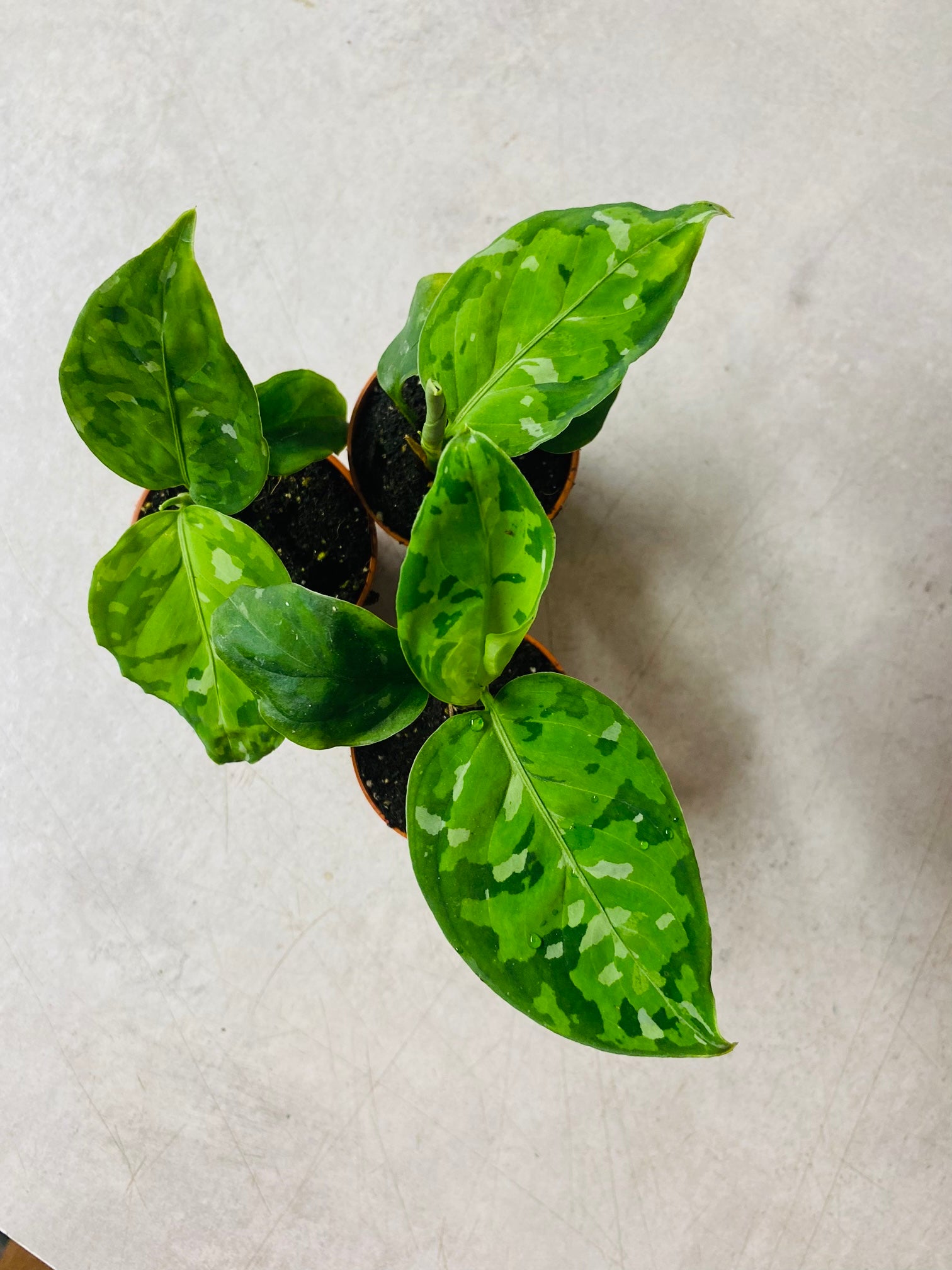 Aglaonema Pictum Tricolor er kjent for sitt unike og iøynefallende utseende. Denne planten har kamuflasjelignende blader som kombinerer nyanser av mørkegrønn, lys grønn og sølv, noe som gir den et eksklusivt preg. Bladene er ovale og vokser på en tykk, trelignende stamme, noe som gir planten et robust utseende. Aglaonema Pictum Tricolor stammer opprinnelig fra tropiske områder i Sørøst-Asia, hvor de trives i skyggefulle skogbunner. Dette gjør den til en av de tropiske planter som er perfekte for lite lys.