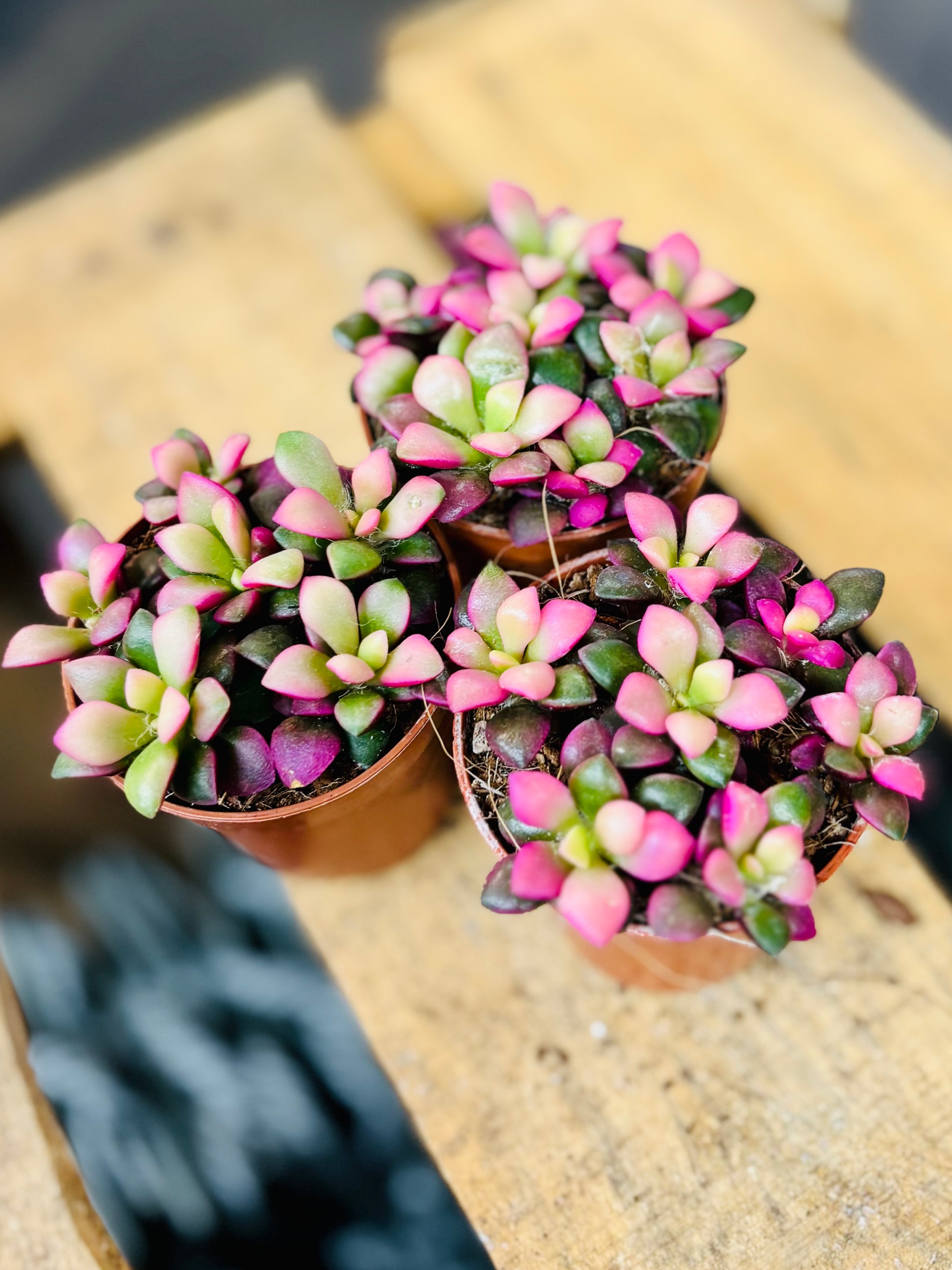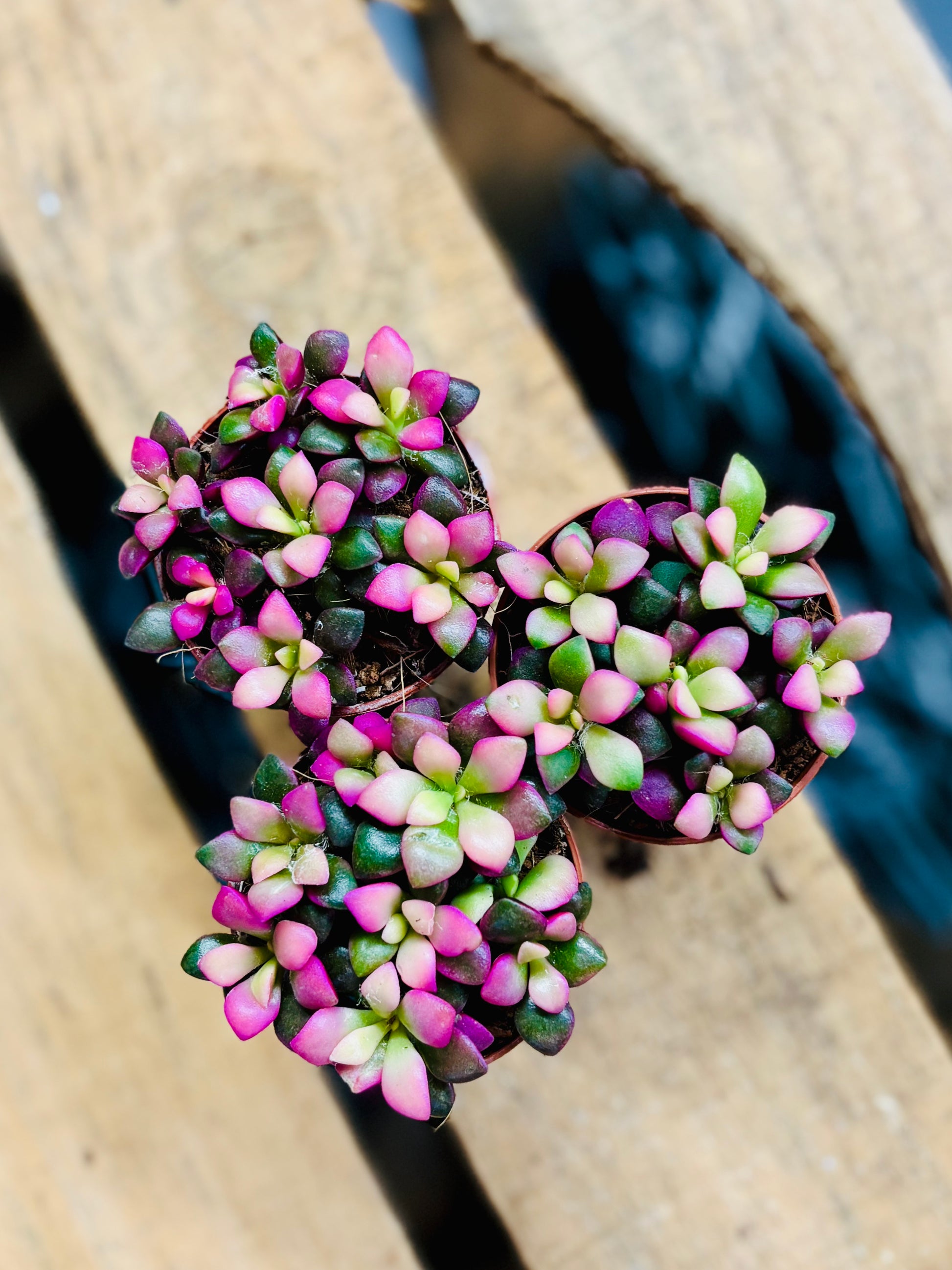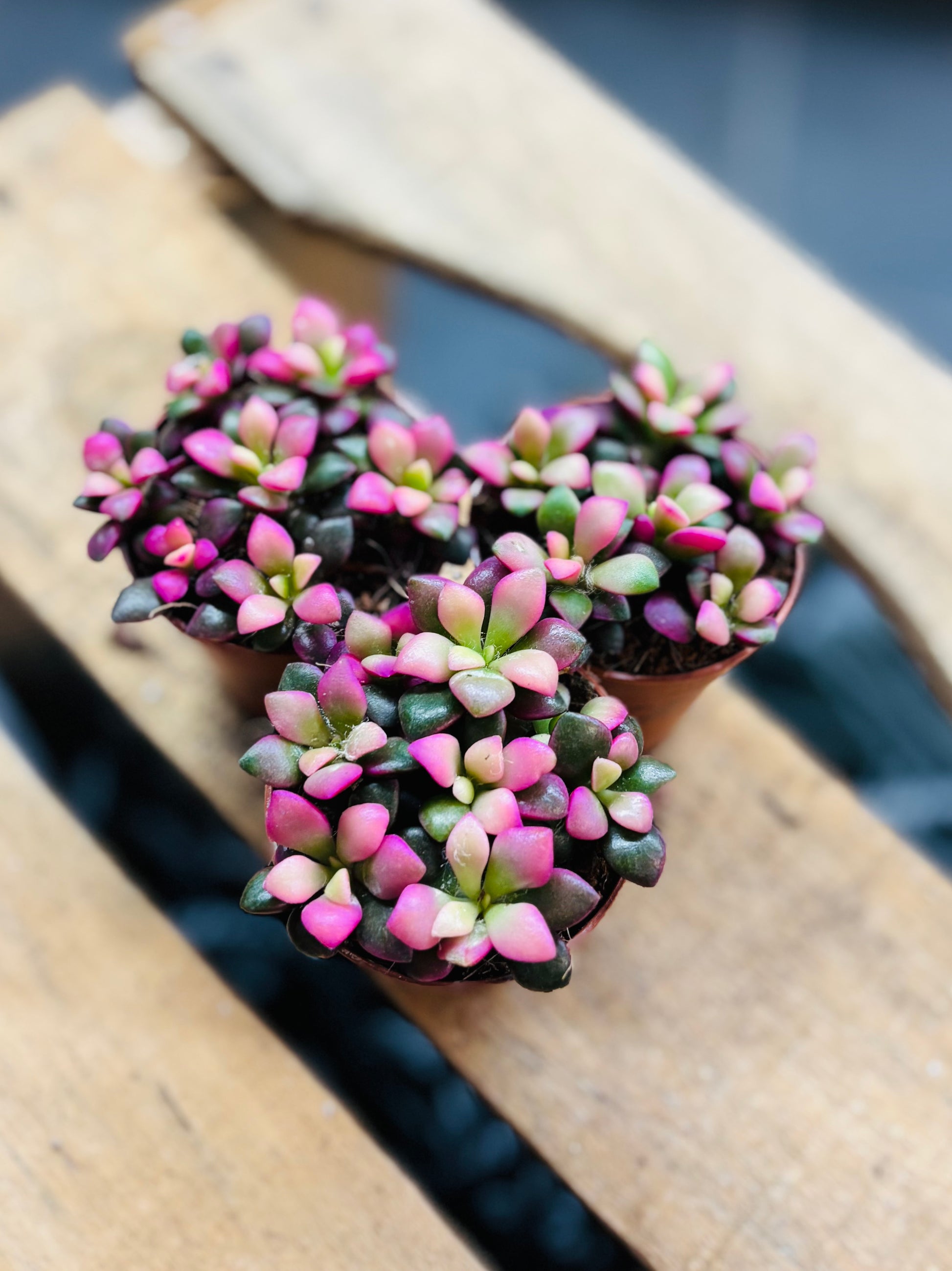 Anacampseros Sunrise er en av de mest sjarmerende og fargerike sukkulentene blant plantesamlere verden over. Denne vakre planten har erobret hjerter med sitt spektakulære navn og sitt unike utseende - kompakte, tette rosetter med blad som kombinerer dype grønne og varme rosa-røde toner. Med sin langsomme, klumpet vekstform og evne til å danne tette matter over tid, er Anacampseros Sunrise perfekt for både nybegynnere og erfarne samlere som ønsker en lettstelt, visuelt slående plante. Denne robuste sukkulenten trives i tørr luft, krever minimal vanning og er ideell for små potter, sukkulent-arrangementer eller som del av en samling. Sunrise kombinerer romantisk skjønnhet, robusthet og enkelt pleie.