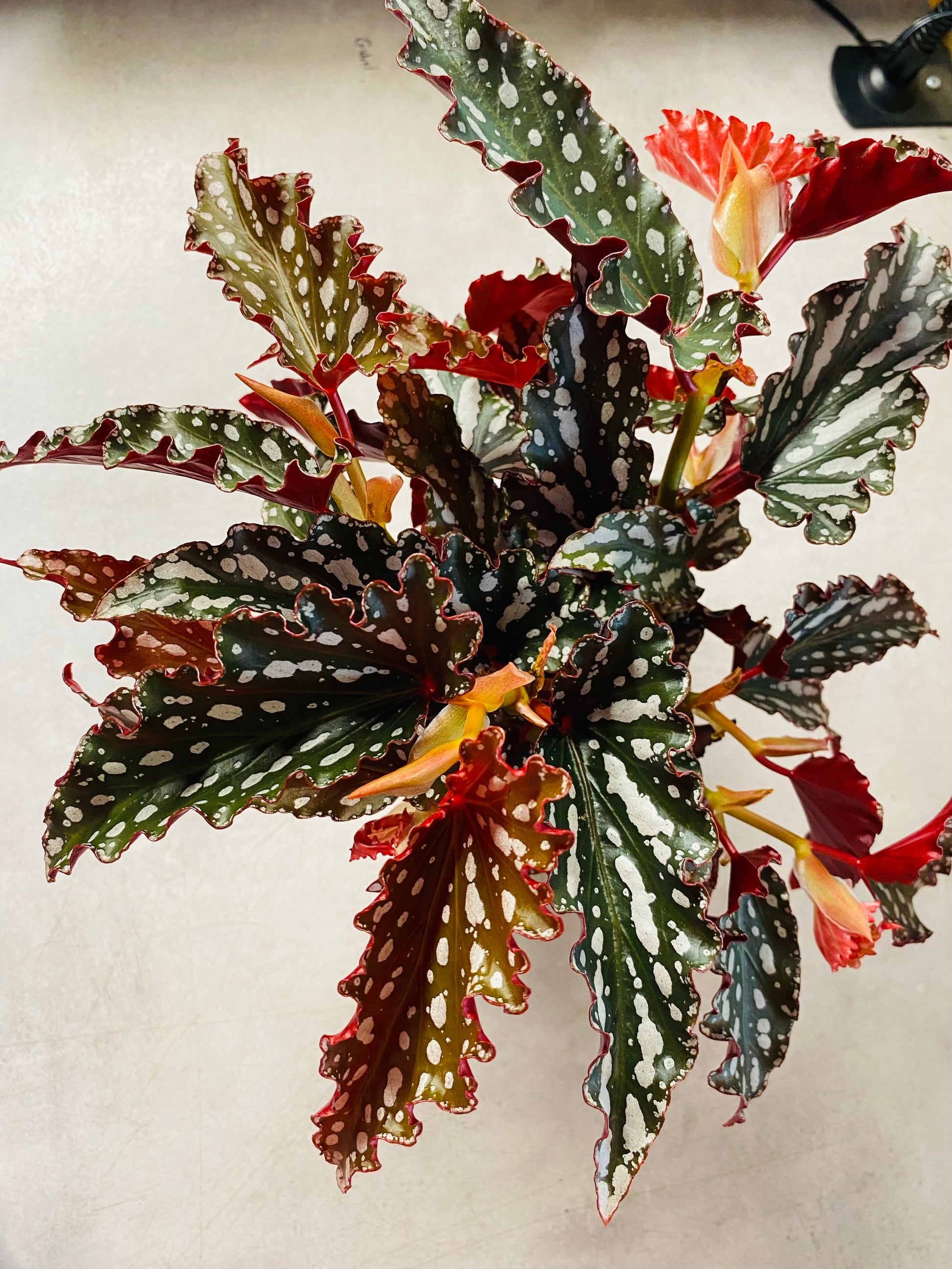 Begonia Maculata “Spotlight Dark” skiller seg ut med sine mørke, vingerformede blader, dekorert med kontrastrike mandelfargede øyeflekker og en underside av dyp burgunder. Et virkelig blikkfang i hjemmet – dramatisk, elegant og spennende.