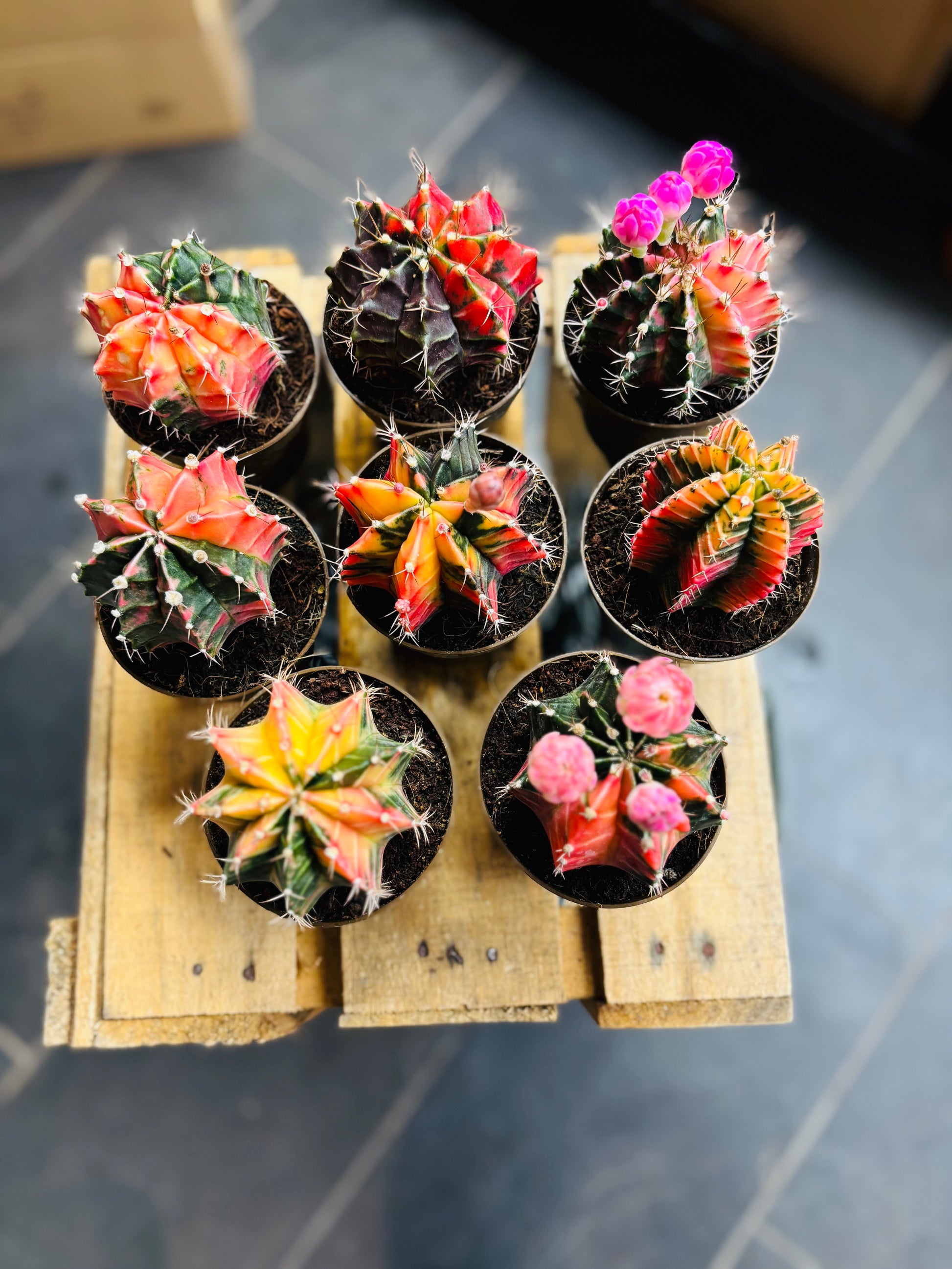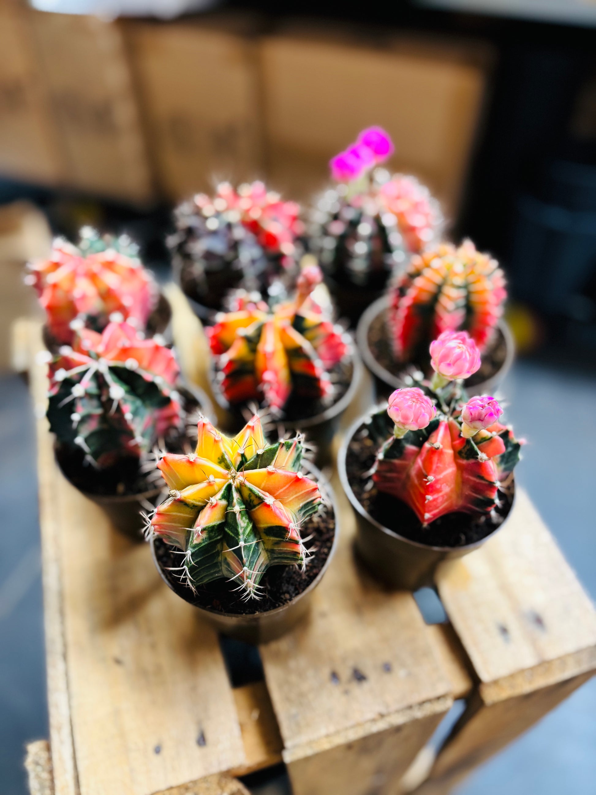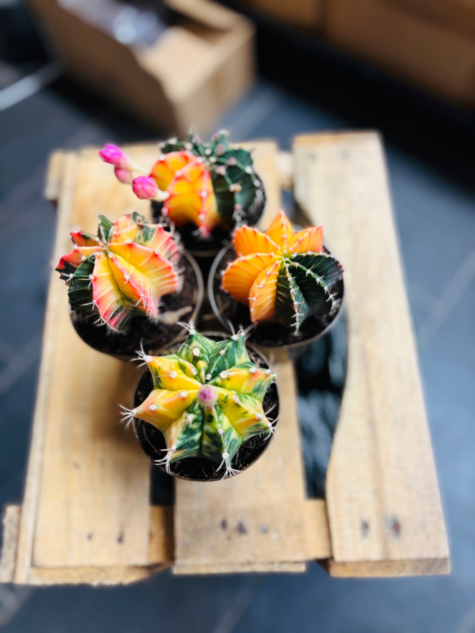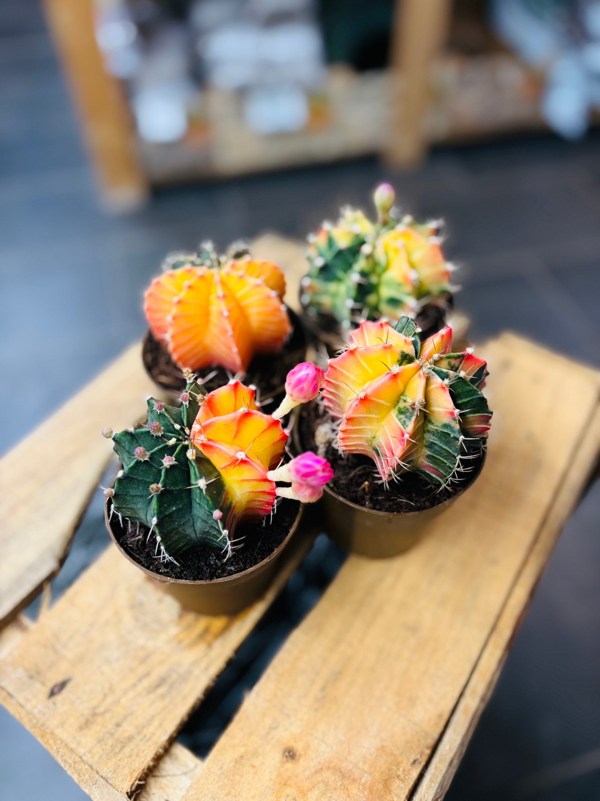 Gymnocalycium Mihanovichii Variegata er en eksklusiv stueplante fra kaktus-familien. Denne sjeldne varianten kjennetegnes av sine unike variegerte mønstre som gir et spektakulært fargespill i stammen. Den kompakte størrelsen gjør den ideell som vinduskarmdekorasjon eller som del av en større plantesamling.