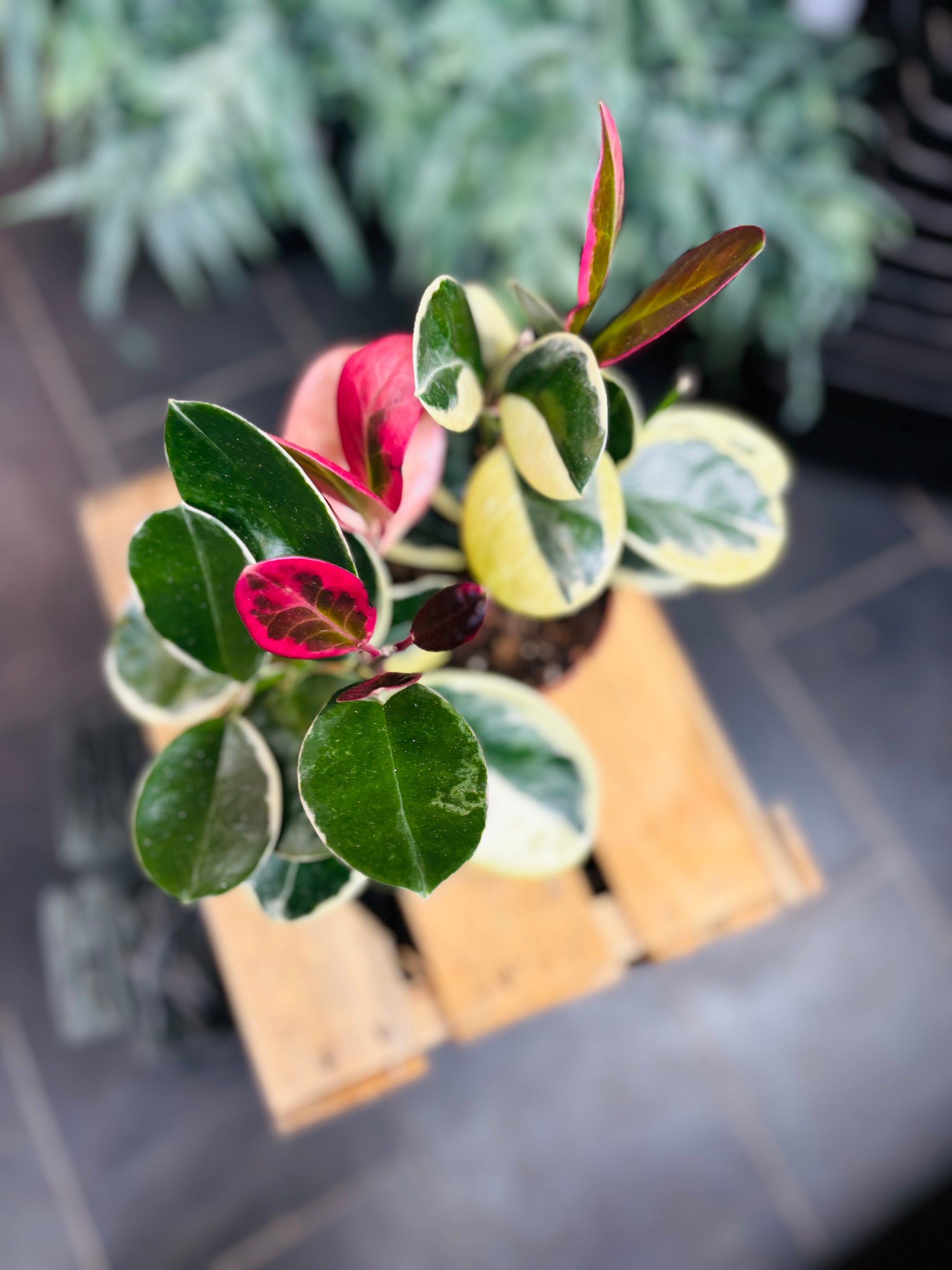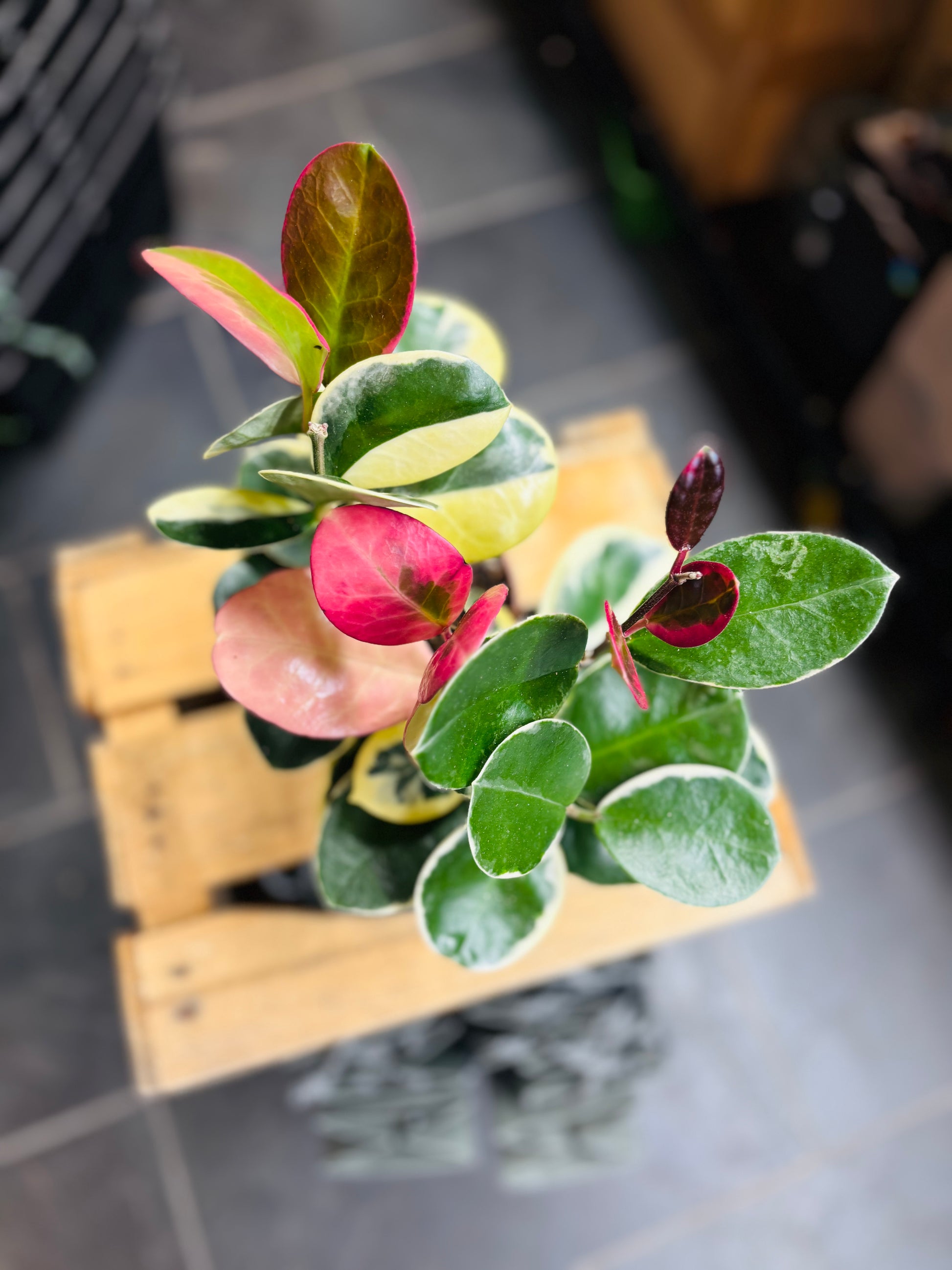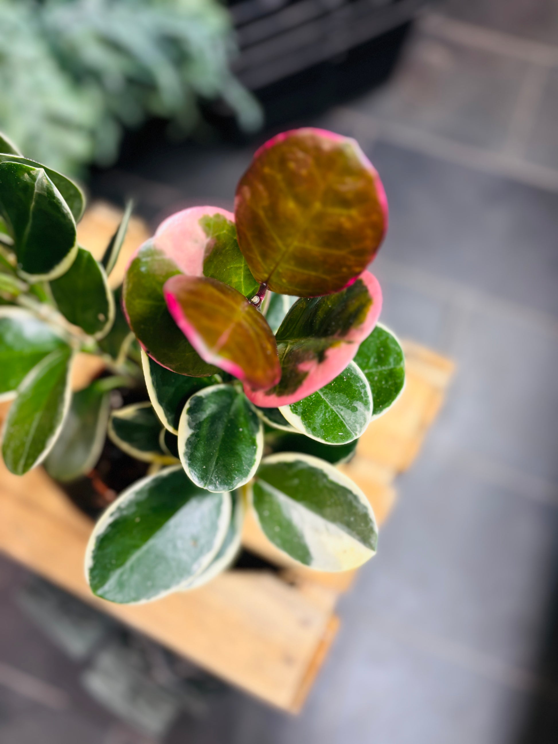 - Variegerte blader i grønt, krem og rosa som skaper et levende fargespill
