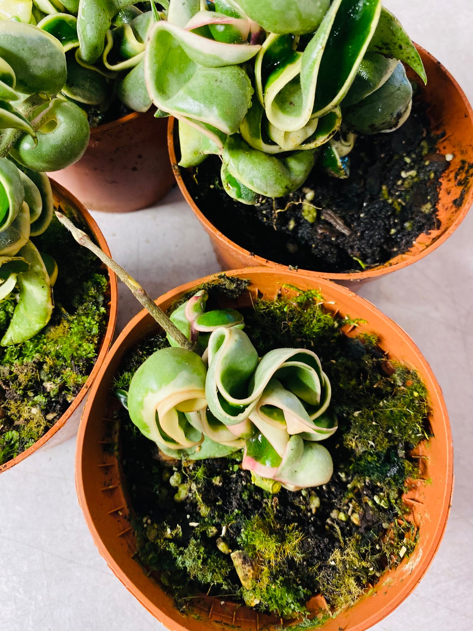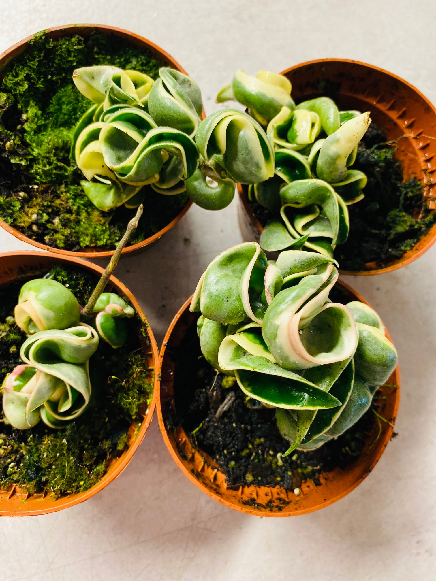 Hoya Carnosa Compacta Variegata, også kjent som Hindu Rope Plant, er en fascinerende klatreplante med unike, krøllete blader som har en vakker variegasjon av grønne og kremhvite nyanser. Denne planten er ikke bare et visuelt høydepunkt, men også lettstelt, noe som gjør den til et populært valg blant planteentusiaster. Hoya Carnosa Compacta Variegata er kjent for sine stjerneformede, voksaktige blomster som blomstrer under optimale forhold.