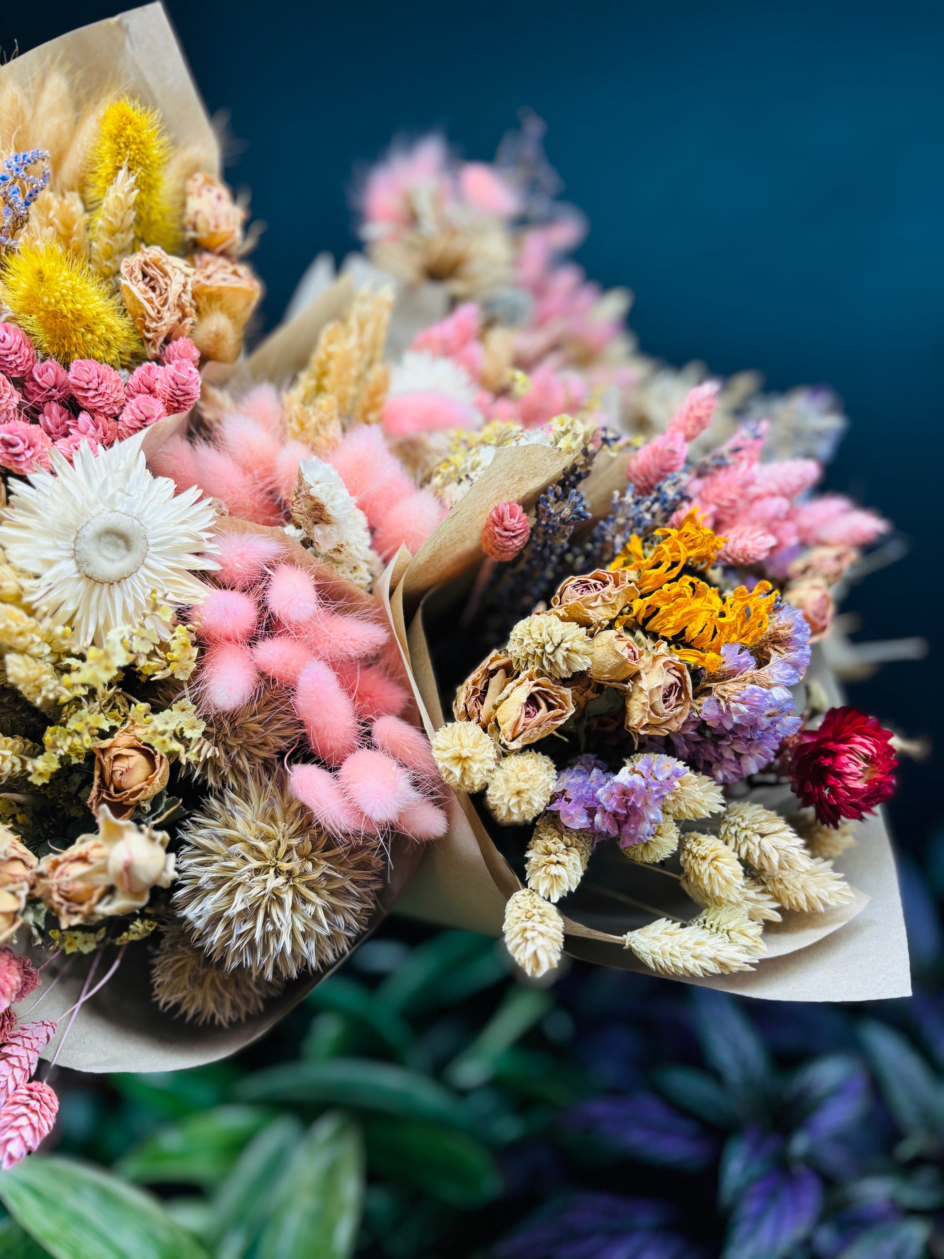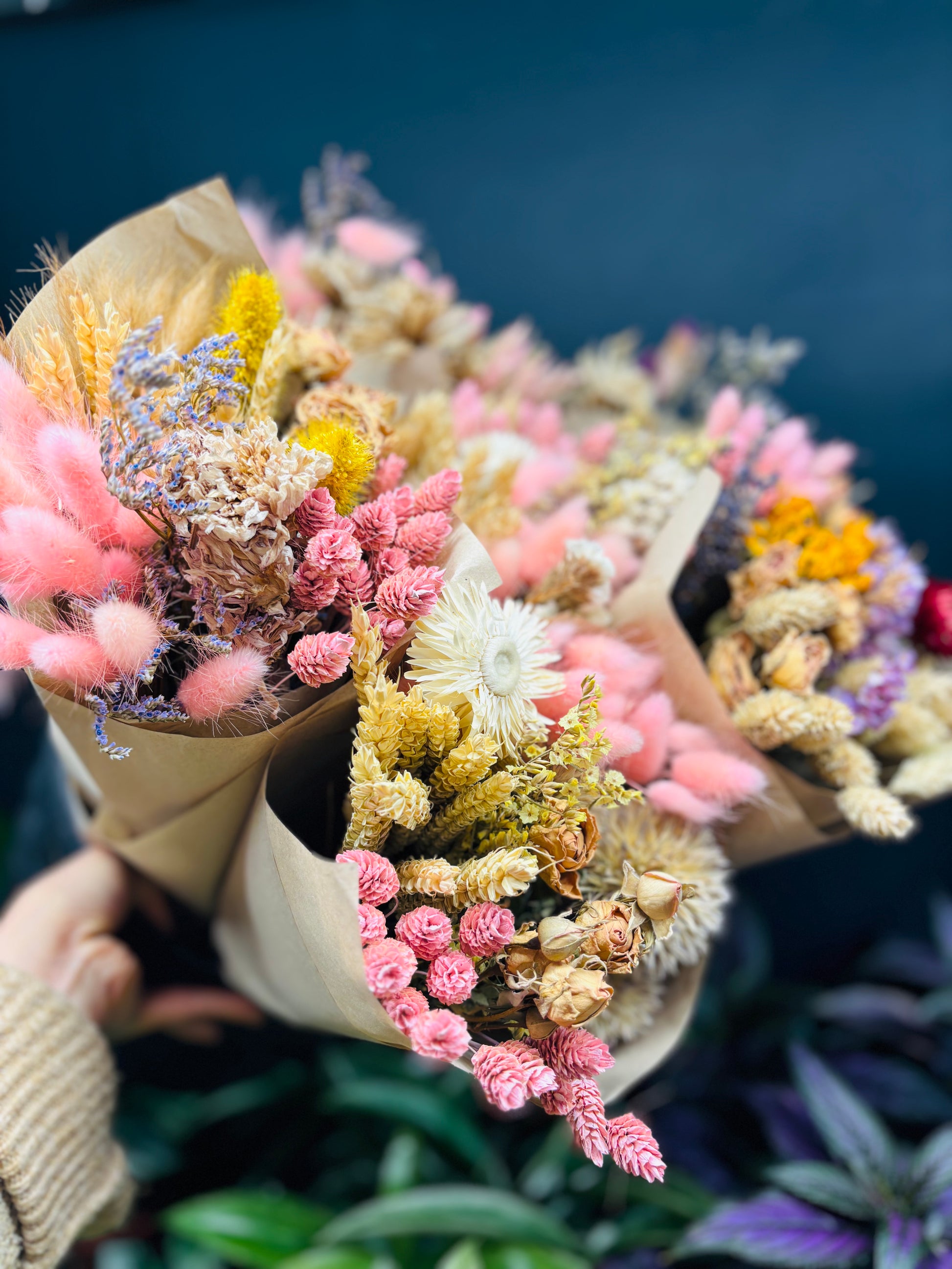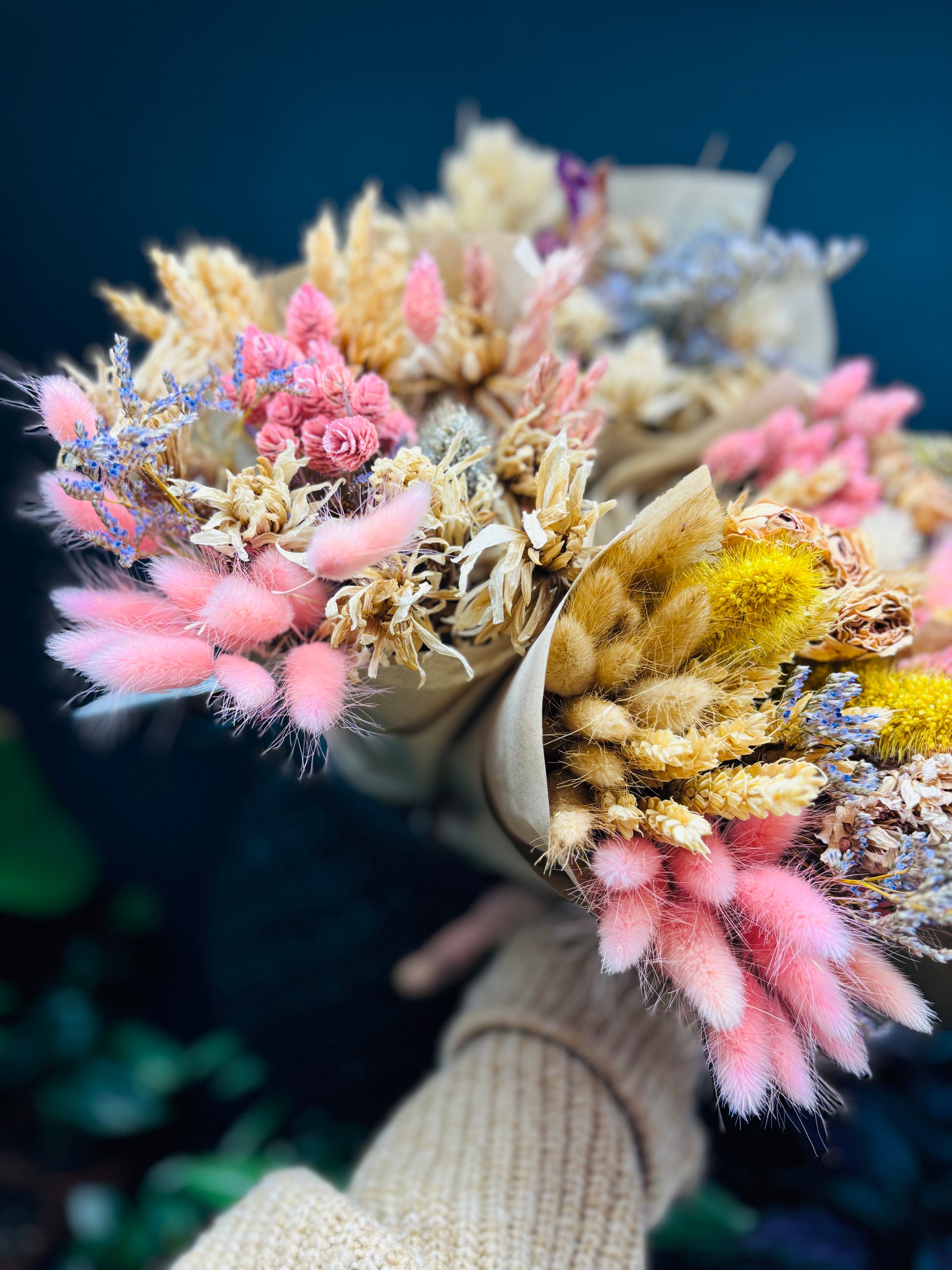 Nydelige håndlagde buketter med tørkede blomster i romantiske rosa nyanser. Hver bukett er unik sammensatt med en vakker blanding av rosa celosia, fluffy bunny tail gress, hvite strawflowers og andre naturlige tørkede elementer. De myke rosa tonene kombinert med naturlige beige og hvite accenter skaper en elegant og tidløs look.