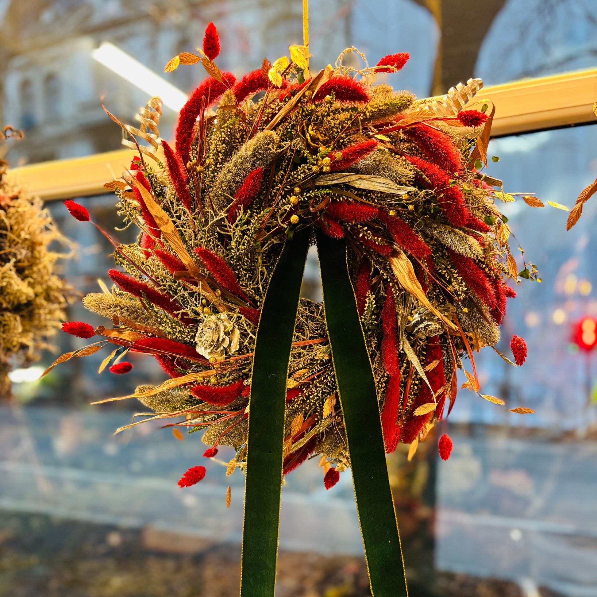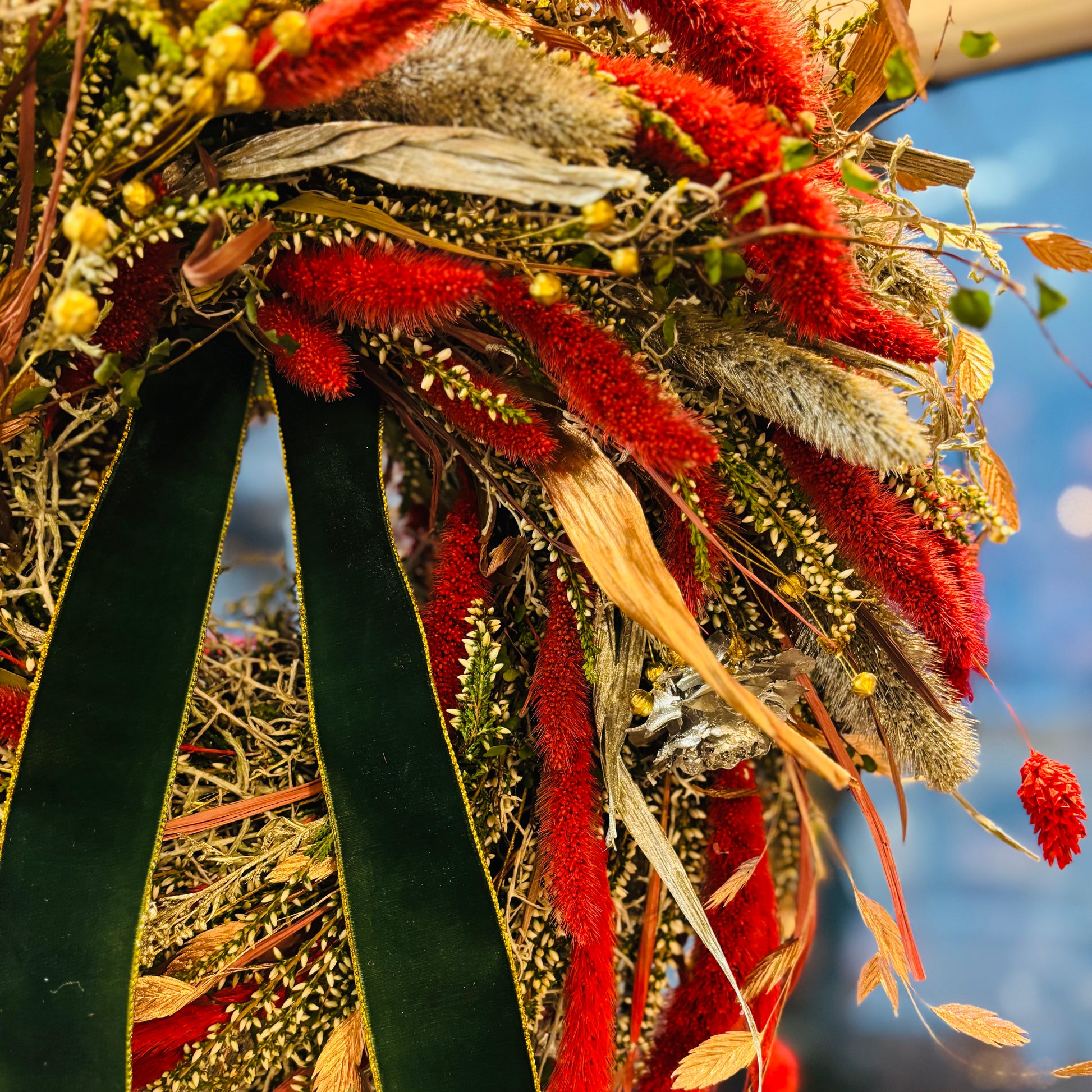 Løft juledekorasjonen til et nytt nivå med Rubinlue Julekrans, en overdådig og elegant krans laget av førsteklasses tørkede blomster i dype rubinrøde toner kombinert med gyldne og naturfargede detaljer. Den fyldige strukturen, de silkemyke stråene og de varme rødfargede elementene skaper et dramatisk, luksuriøst uttrykk som tilfører hjemmet ekte julemagi – perfekt både inne og ute under tak.