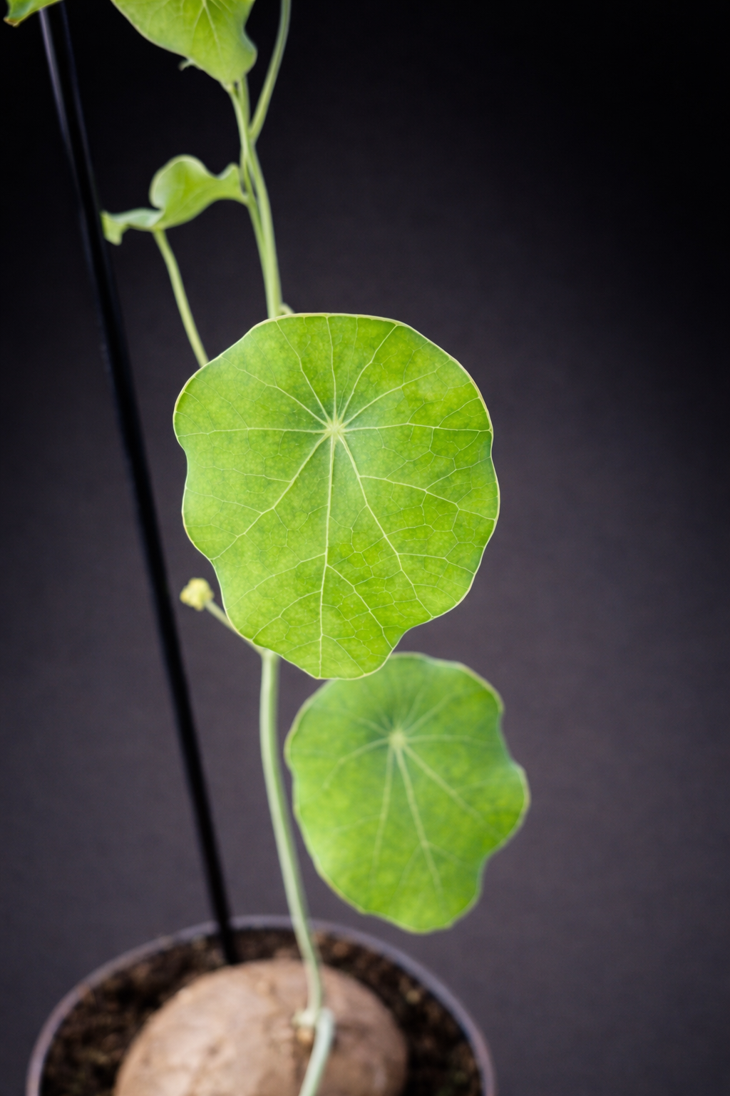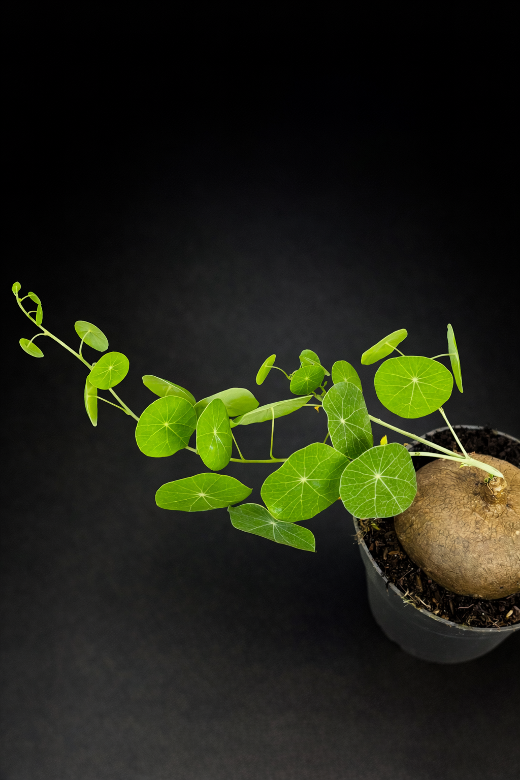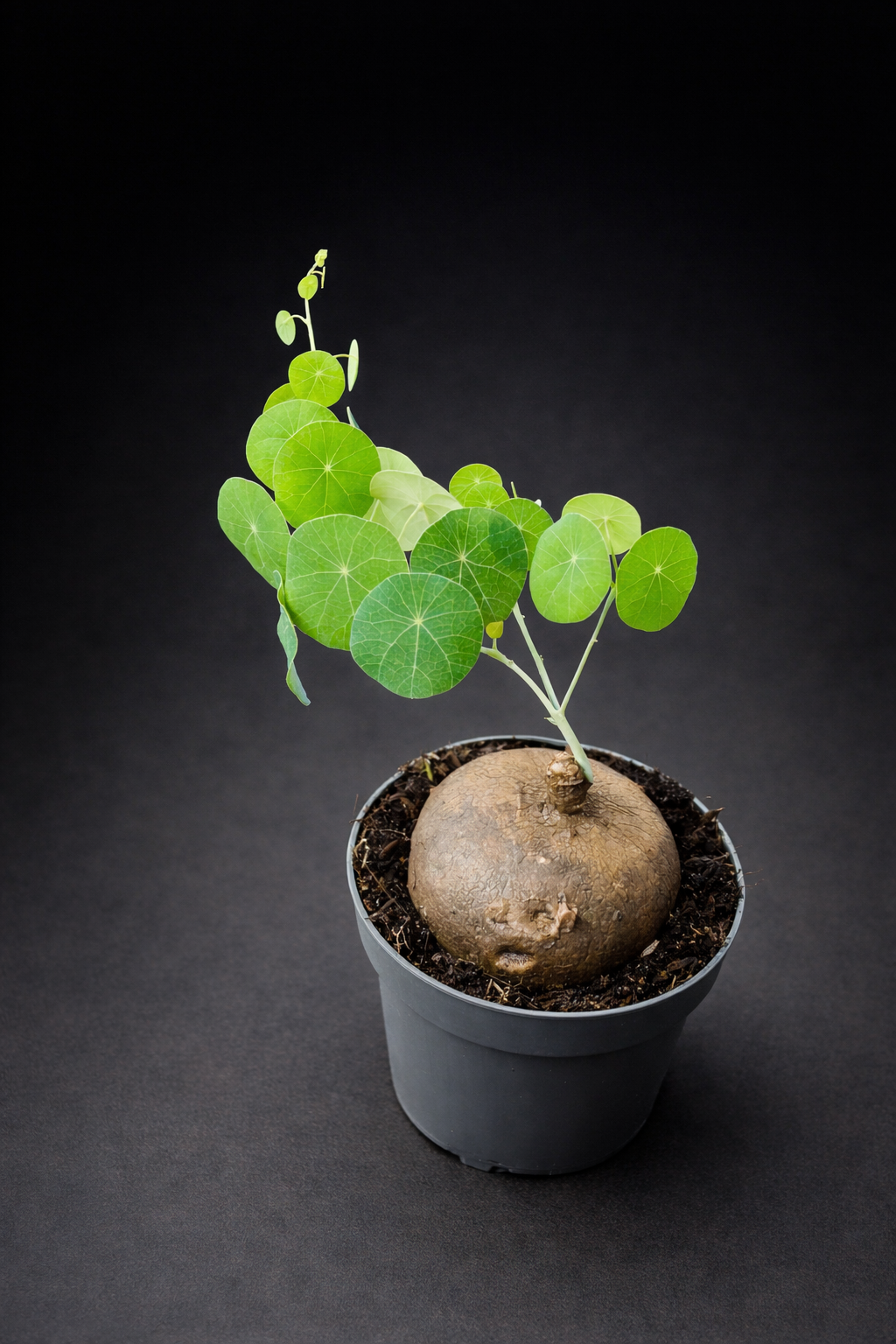 Stephania Erecta er en unik og skulpturell plante kjent for sin karakteristiske caudex – en rund, knollformet base – som gir planten et nesten kunstnerisk uttrykk. Fra den glatte, sfæriske knollen vokser slanke stilker med runde, skjoldformede blader i frisk grønn farge. Det minimalistiske og balanserte formspråket gjør Stephania Erecta til et naturlig blikkfang i moderne interiører.